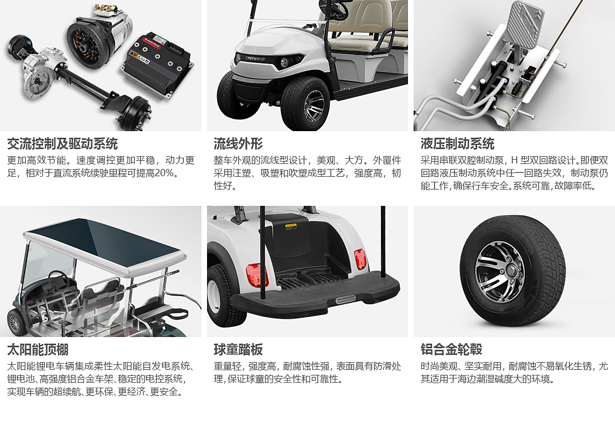 同向四座高爾夫球車(chē),可以供4名球手和2名球童同時(shí)駕乘,也可以供3名球手和3名球童同時(shí)駕乘。